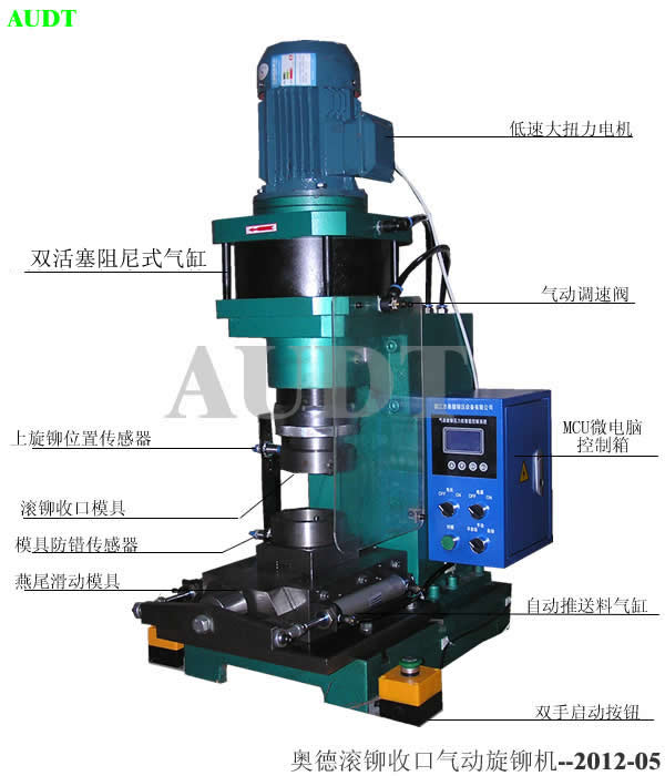 气动旋铆机的应用范围主要是在汽车零部件、五金件、金属与非金属的连接件、轴承铆配、电子行业空心实心铆钉的铆接、有铆钉的或连接轴,螺母翻铆,高、低压配件,自行车零部件,渔具制造业,门窗五金等等行业铆接机的分类主要是根据铆压能力来分类的,若需要空心冲铆有两种可以实现铆接,要求不高,自动送料,能不脱落,不承受拉脱力,的可以用自动送料铆钉机,而且空心铆钉壁厚要求很薄,不能太厚,否则也难以实现工艺要求,如果铆接要求很高实心的或空心壁厚较大铆接强度要高牢固外观要求较高,那必须用旋铆机铆接机来实现您可以点击我们的“部分客户产品铆接照片”来了解它。 相关链接 → 铆接机︱旋铆机原理 ∣ 铆接机︱旋铆机分类 ∣ 铆接部分客户的产品照片∣非标定制旋铆机铆接机 * 2008 audt riveting & pressure machine